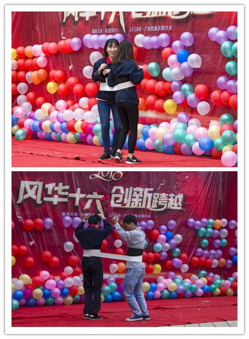 通過轉(zhuǎn)圈方式把腰上的布條纏到隊(duì)友上,纏的過程中不可以用手觸屏。大家為了比賽,為了榮譽(yù),也為了歡笑,各出奇招,現(xiàn)場一片歡鬧。